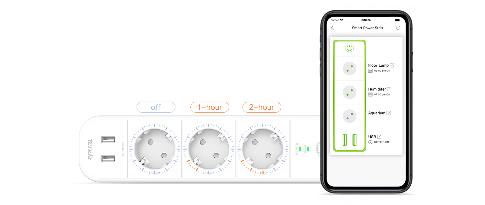 Tenda SP15 is a smart power strip designed to work in the Beli system. It is equipped with 3 power outlets and 2 USB ports. With the help of the application you can remotely manage the power supply, each outlet can be configured individually. An additional advantage is the ability to set work schedules. For example, if you have a lamp connected to outlet 1, you can configure the schedule so that the power turns on at a given time.